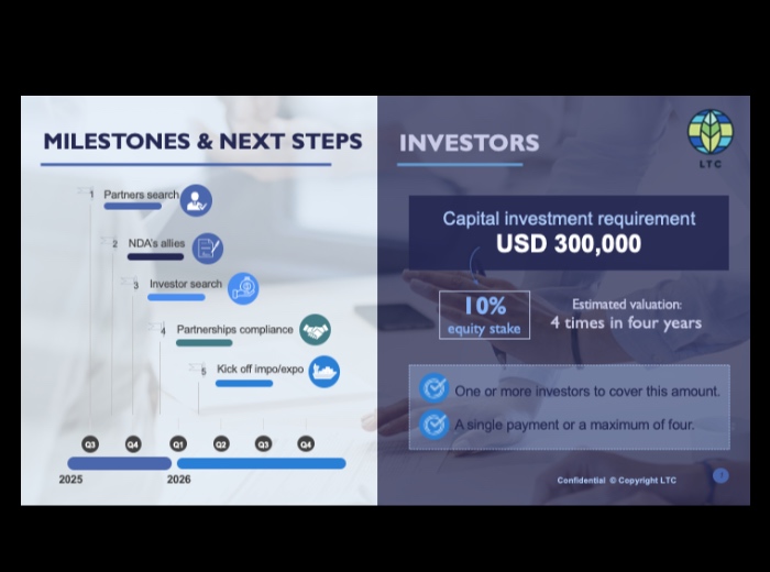 Inversión Requerida: Se solicitan USD 300,000 (inyectables fraccionadamente) para la fase de inicio de operaciones.