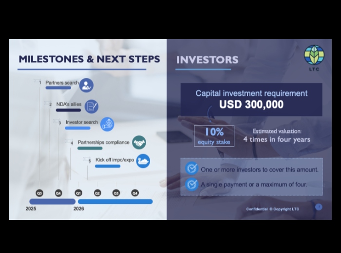 Inversión Requerida: Se solicitan USD 300,000 (inyectables fraccionadamente) para la fase de inicio de operaciones.